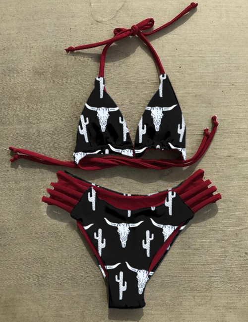 Meet our Kinsley top. In our original "Forest" print, this top is a classic triangle cut bikini with fully adjustable string ties. Length: regular Material: cotton blend Sleeve Type: sleeveless Neckline: v neck Style: western If you are in-between sizes we recommend sizing up! See Sizing chart in the pictures below.