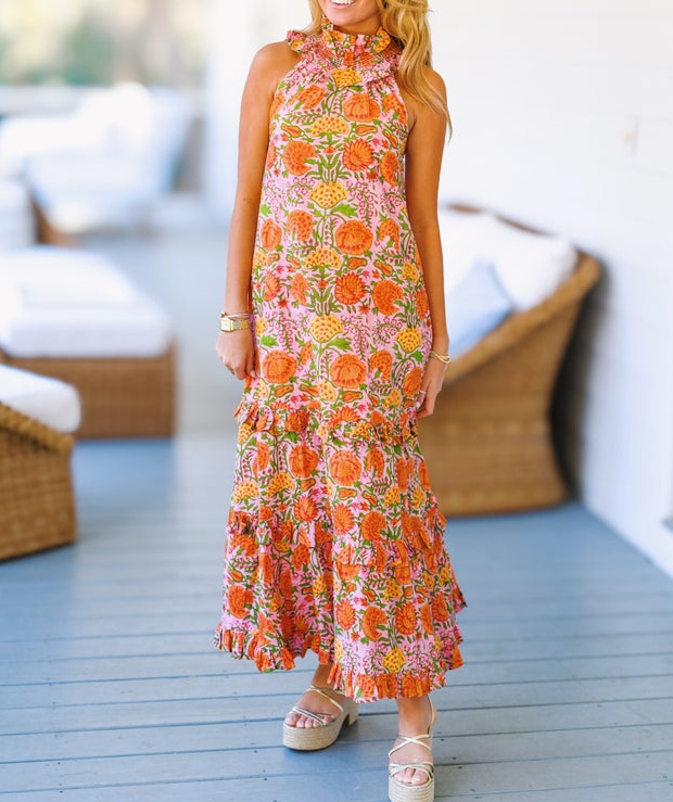 Dress to impress in our Sophie Frill Neck Maxi Dress. The eye-catching pink and yellow floral print and elegant frill high neck make this dress a must-have for any special occasion. Stand out and feel confident in this stunning maxi dress.