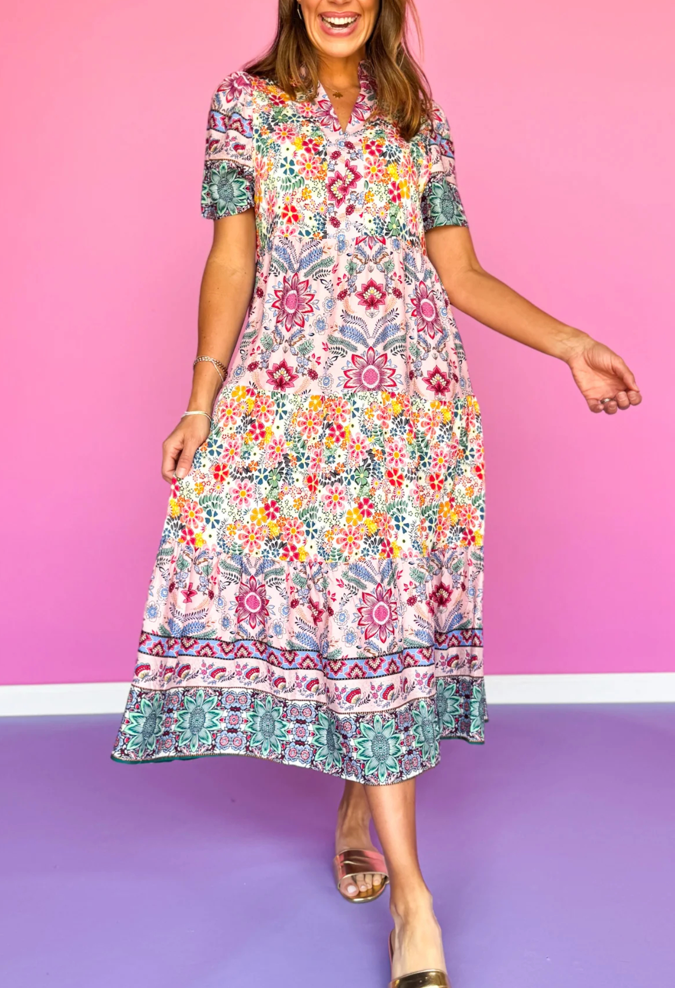 Printed ruffle neckline cascading midi dress