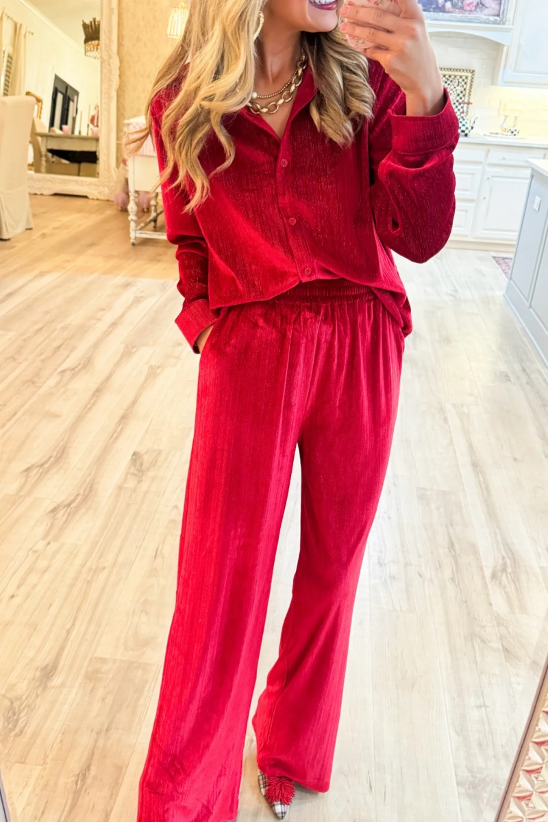 Red Velvet Button Up Pant Set