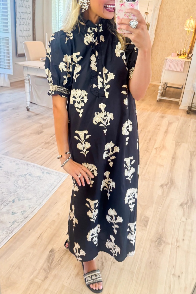 Black Floral Print Short Puff Sleeve Midi Dress